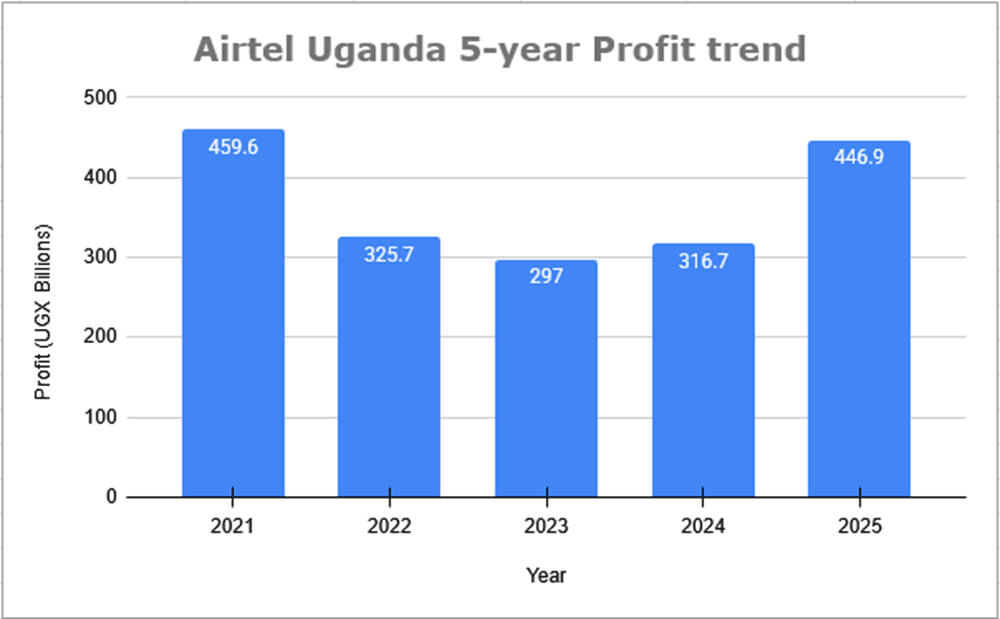 To put 2025’s standout performance in context, here’s a quick look at Airtel Uganda’s profit after tax (PAT) in recent full-year results (all in UGX billions, rounded where needed based on official reports):