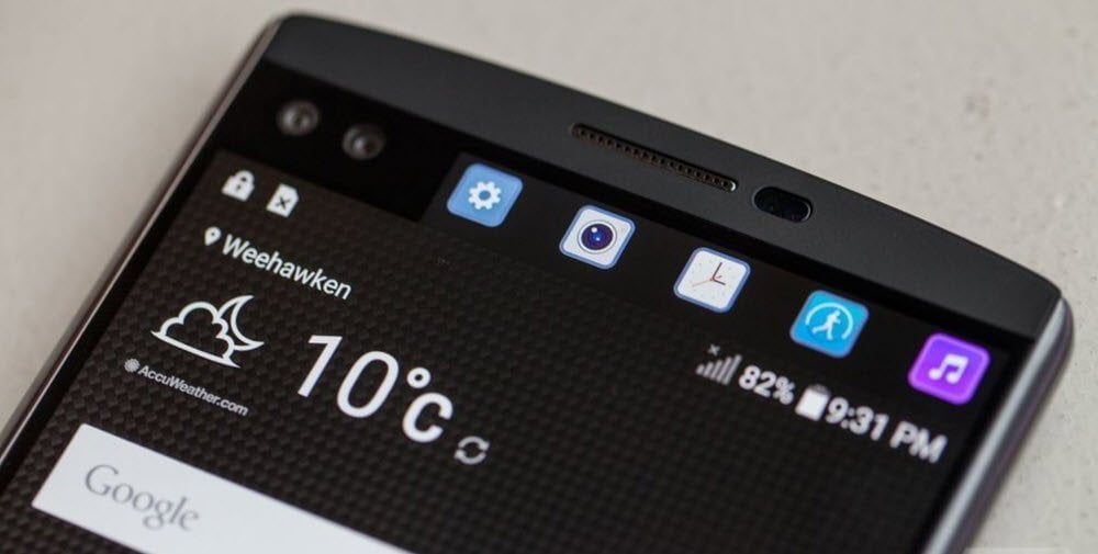 The feature is what LG calls a “second screen.” It placed just to the right of those cameras and it’s a 1040 x 160 display that is joined to the main display. Look as it like Samsung’s “Edge screen.” which is always on (if you so wish), and LG claims it will drain less than 5 percent of your battery when used for a full day. It is used for quick access to contacts, app switching, to toggle the Wi-Fi on and off, turn the flashlight on, control your music, and more. The small screen can also be used to control certain apps like to change modes or zoom in the camera app.