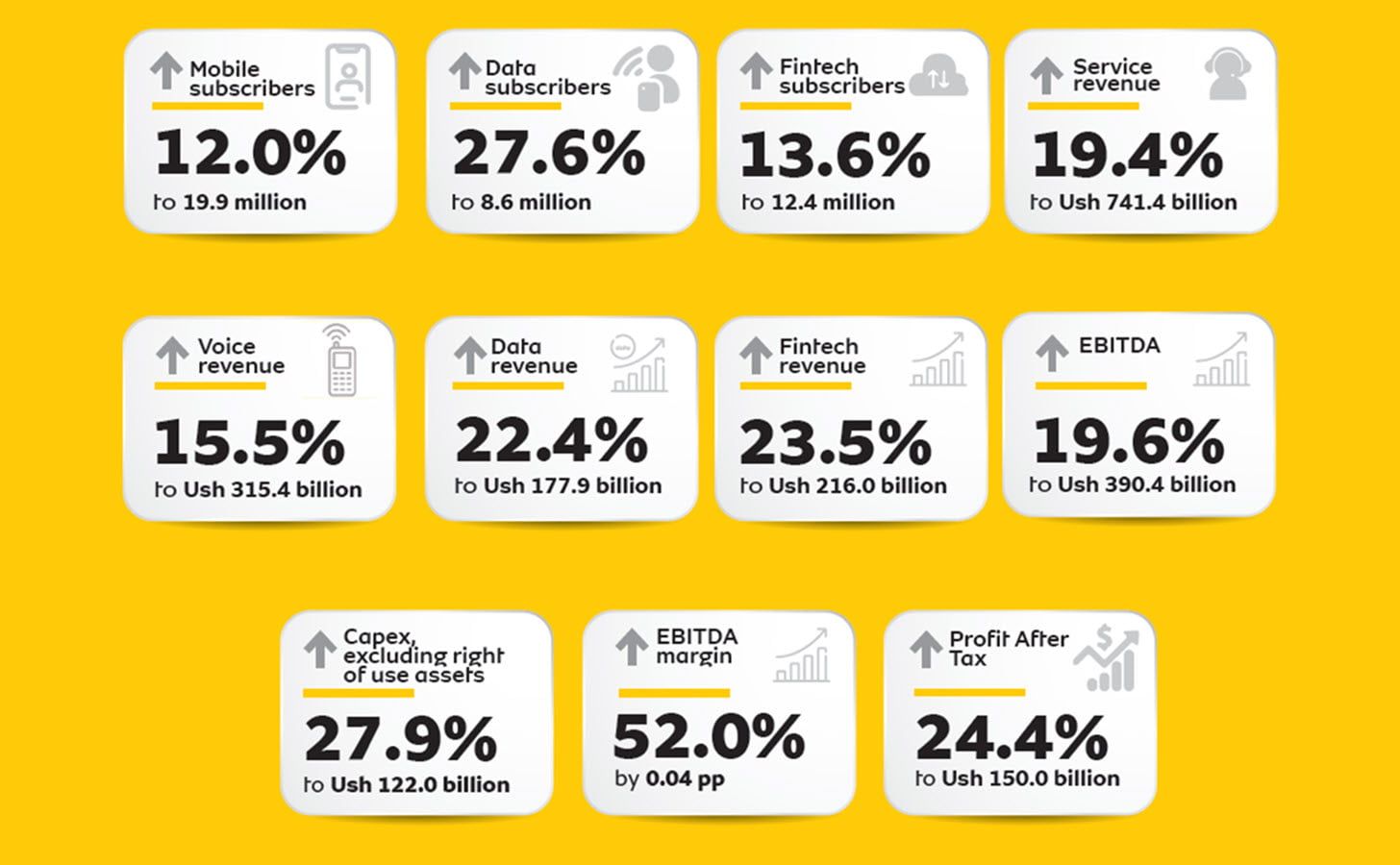MTN Uganda’s mobile money (MoMo) platform continues to see strong growth. The number of fintech subscribers increased by 1.5 million year-over-year, leading to a 26.6% growth in transaction volume and a 17.8% growth in transaction value. This indicates that more and more Ugandans are embracing mobile money for various financial transactions.
