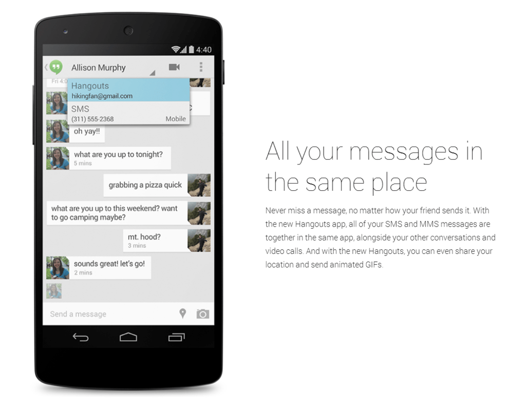 only Hangouts — all it took was an update of the app to integrate SMS, and work better for voice calling, and it’s now part of the way you’ll talk to other people on Android. ‘SMSing’, instant messaging, even voice and video calling , are all now under the same roof – since Android is open and if you dont like your text messages living under hangouts , of course, you can download a 3rd party default SMS app from the Google Play store.